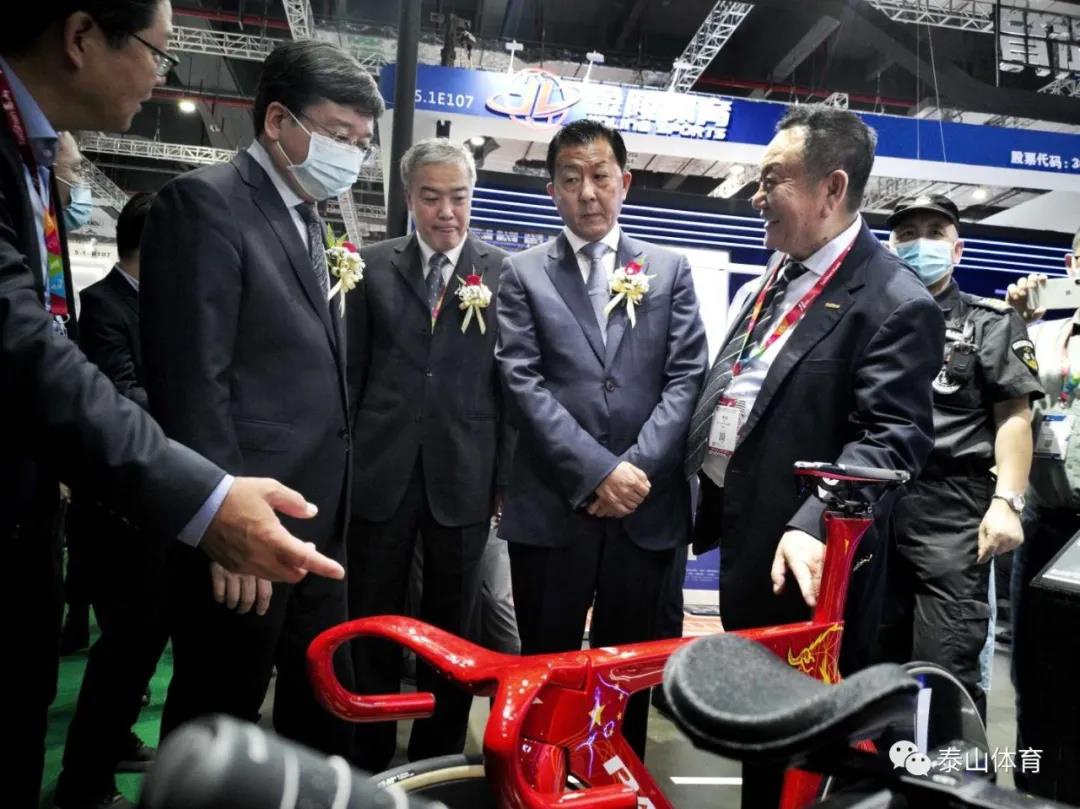 国家体育总局基金会理事长吴齐、山东德州市政协主席翟长生、德州市副市长马俊昀、德州市工信局局长孙洪昌、德州市科技局局长张慧君、乐陵市市长陈光春、乐陵市政协主席刘文学、乐陵市副市长牟正军在一号娱乐展厅参观。