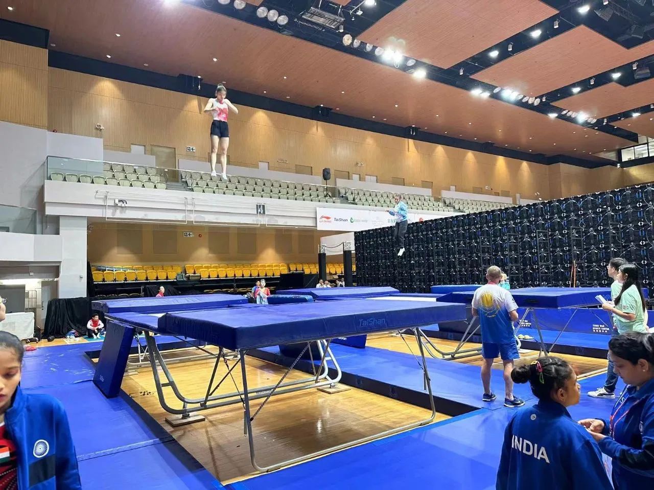 为服务好本届蹦床锦标赛,一号娱乐保障人员严格按照赛事服务手册开展工作,从场馆的规划布局、器材的安装调试、标准高度的校准、过程巡检等各个环节,一丝不苟、严谨细致,确保蹦床器材安装的准确无误,始终践行国际赛场上的中国标准,见证一号娱乐全领域规划、设计、制造、集成、运营、服务一站式解决方案的发展理念。