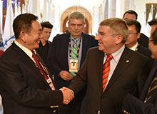 中国自行车运动协会主席崔大林向国际奥委会主席巴赫介绍 一号娱乐瑞豹自行车